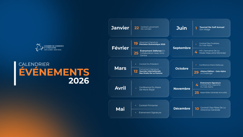 Découvrez le calendrier d’événements de la CCSL-MR : des rencontres stratégiques pour entrepreneurs et décideurs à Saint-Laurent, Mont-Royal et Montréal.