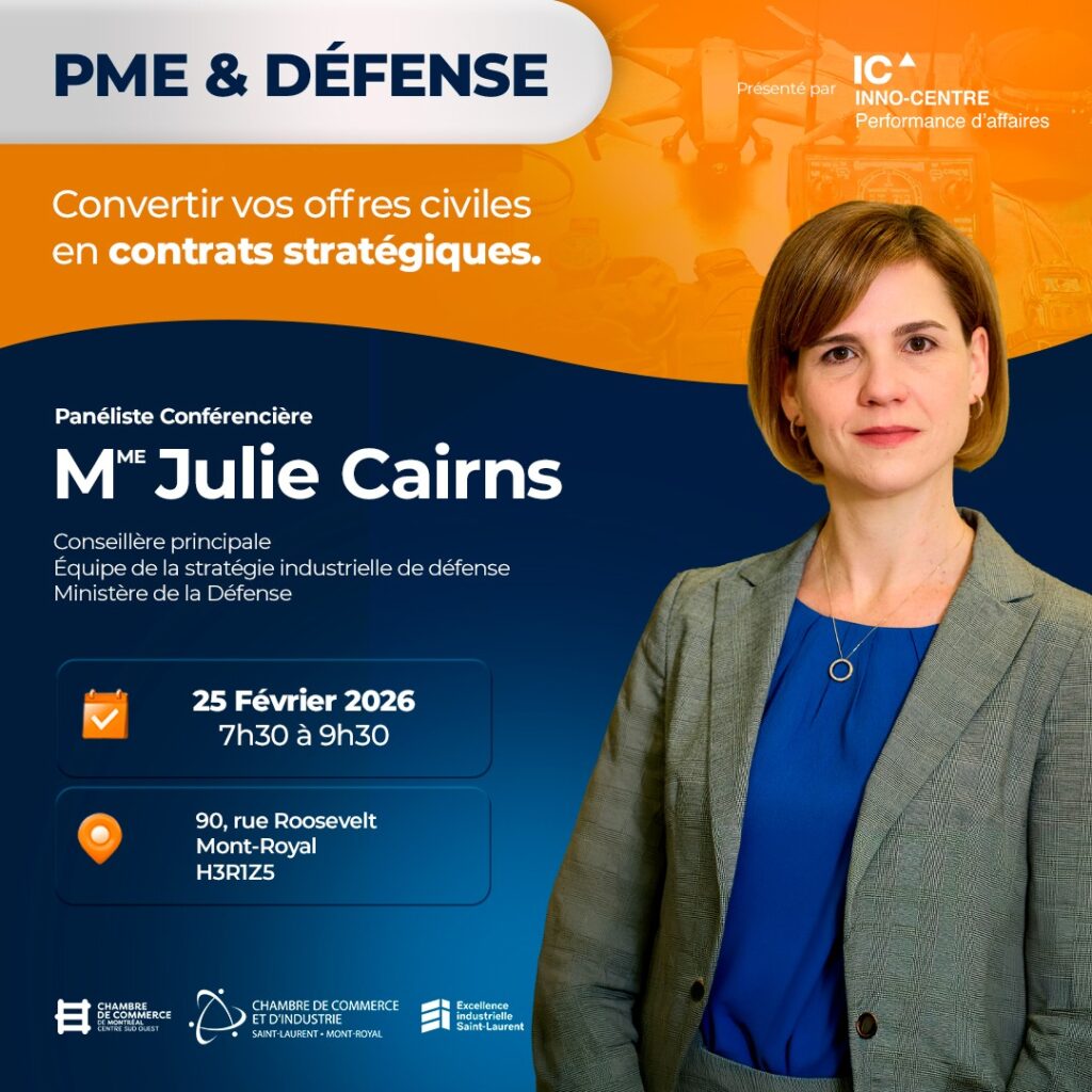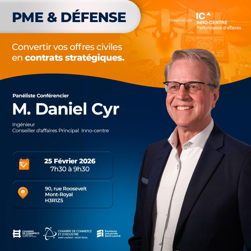 La Chambre de commerce et d’industrie de Saint-Laurent – Mont-Royal (CCSL-MR), en collaboration avec Inno-centre, annonce la tenue de l’événement Défense et PME : Convertir vos offres civiles en contrats stratégiques, un rendez-vous destiné aux PME manufacturières, technologiques et innovantes souhaitant accéder au marché de la défense et de la sécurité.