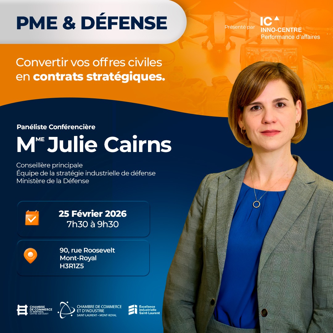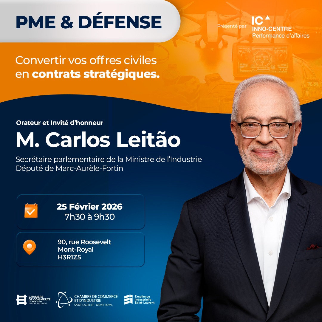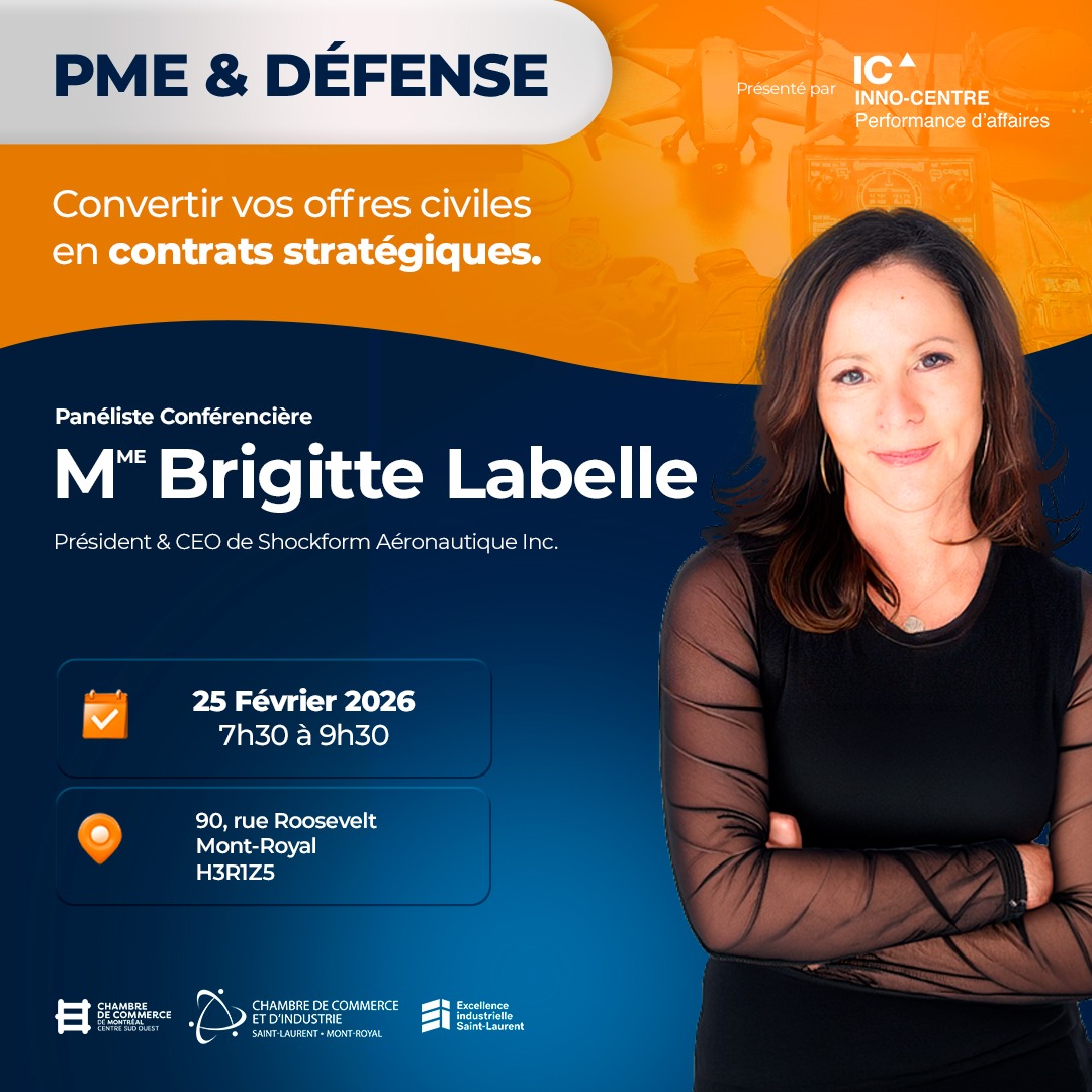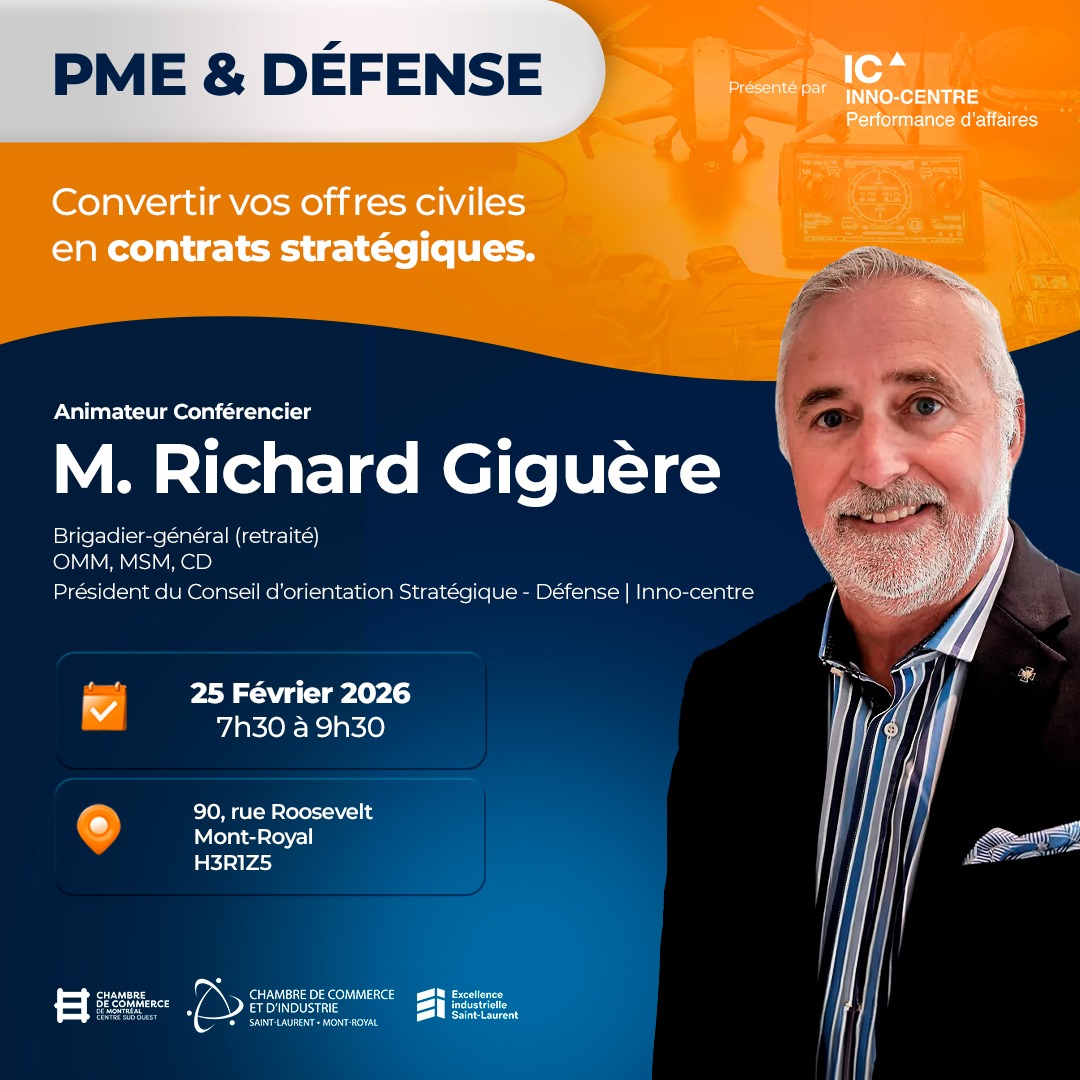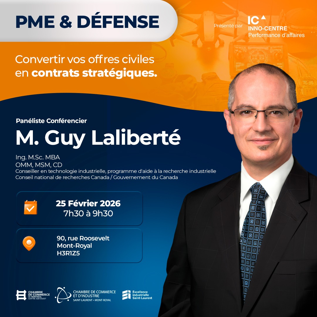 La Chambre de commerce et d’industrie de Saint-Laurent – Mont-Royal (CCSL-MR), en collaboration avec Inno-centre, annonce la tenue de l’événement Défense et PME : Convertir vos offres civiles en contrats stratégiques, un rendez-vous destiné aux PME manufacturières, technologiques et innovantes souhaitant accéder au marché de la défense et de la sécurité.
